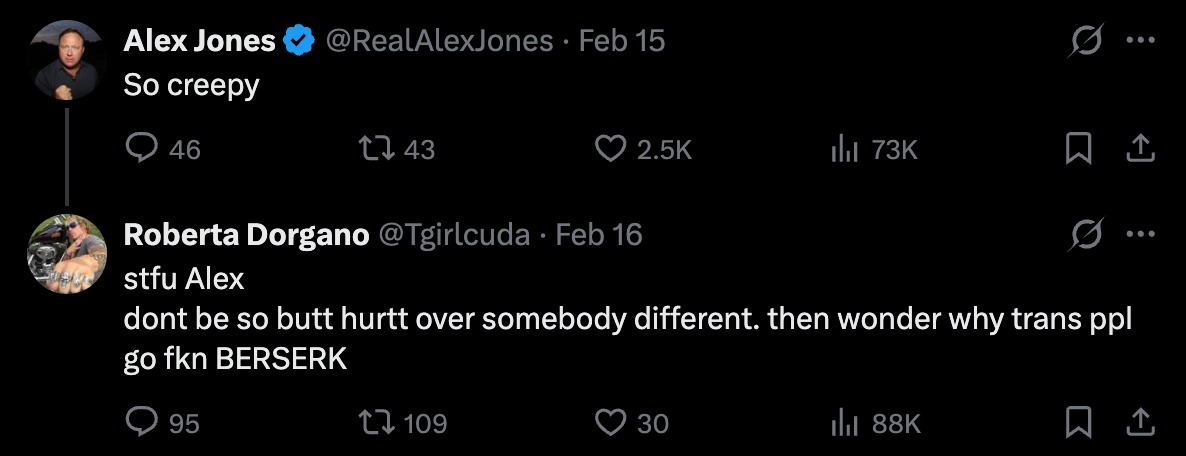 Neposredno prije toga, izrazio se na vrlo sličan način desničarskom voditelju Alexu Jonesu: „Je*i se, Alex. Nemoj se toliko ljutiti zbog nekoga drugačijeg. A onda se pitaj zašto transrodne osobe je*eno POLUDIŠE.“)