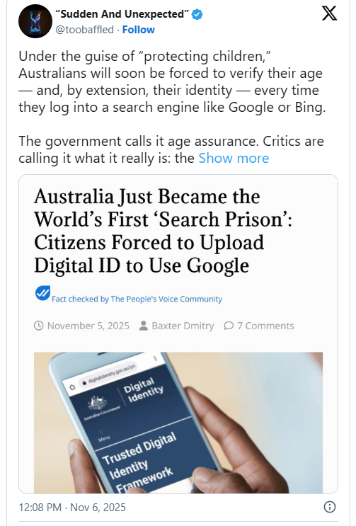 Under the guise of “protecting children,” Australians will soon be forced to verify their age — and, by extension, their identity — every time they log into a search engine like Google or Bing.