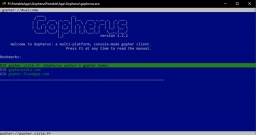 Gopherus is a free, multiplatform, console-mode gopher client that provides a classic text interface to the gopherspace (it does not browse standard web servers/pages). The interface colors can be customized with a manual configuration file and bookmarks can be saved.