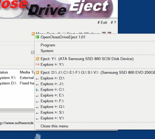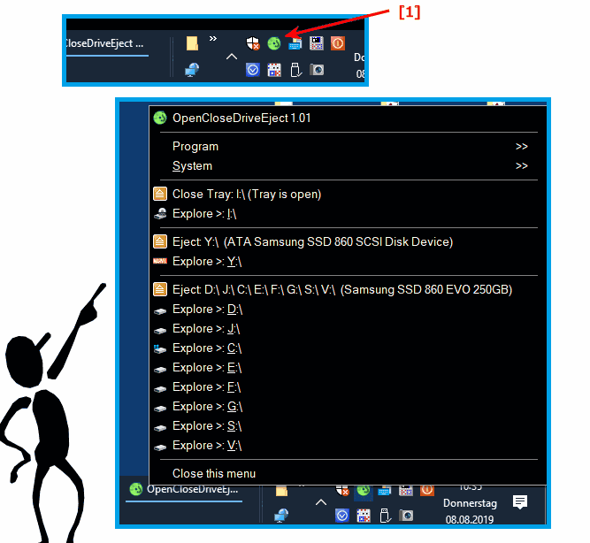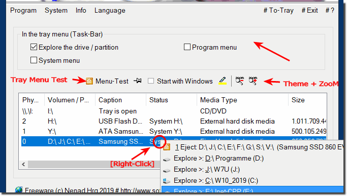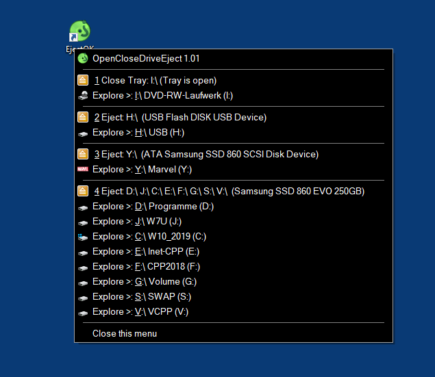 Start the program. The first time you will be offered the default setting for the safe removal of USB, SD, ... drives. For example, directly opening the drives (Explorer) for opening, closing, and ejecting drives through the Info area of the taskbar. But you can quickly customize everything!