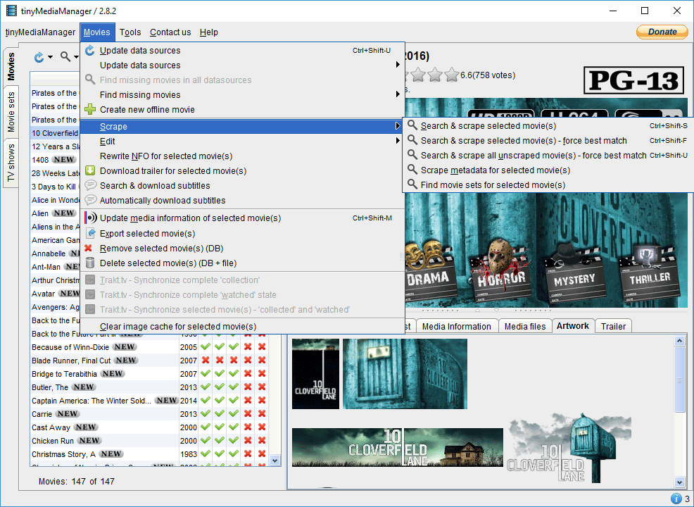 tinyMediaManager downloads the associated movie artwork, cast, plot and other media details. Each movie or show is nicely presented with matching background art, genre and ratings.