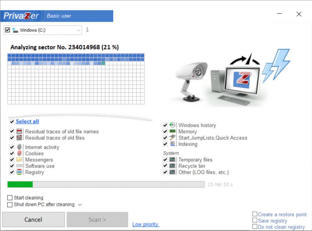 One of the main features of PrivaZer is its ability to scan and analyze your system thoroughly, identifying and deleting various types of unwanted data, including browsing history, cookies, temporary files, and other residual files that may compromise your privacy. PrivaZer also goes beyond standard cleaning by securely overwriting the deleted data, making it unrecoverable, thereby preventing any potential data recovery attempts.