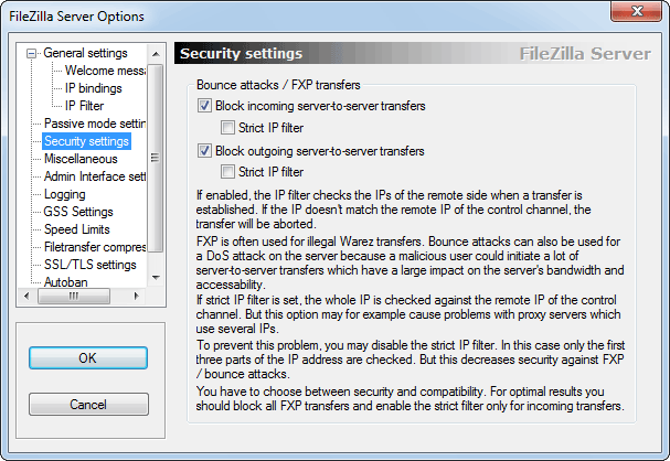 FTP server FileZilla Server is a full featured FTP server with support for secure SSL/TLS connections, IP security, anti-FXP options, per-user speed limits, user groups and MODE-Z compression. It provides a plain, but easy to use interface that can be installed as Windows service.