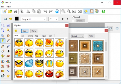 Easily add text effects to image, such as shadow text, ripple text, gradient color text etc. PhoXo website provides a large number of resources, including step by step tutorials, thousands of free clip-art, frames, patterns, textures and shapes.