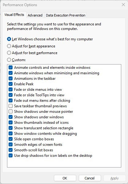 However, it’s a lot easier to just select the Adjust for best performance option at the top of the screen and click OK. Windows 11 will then turn off the effects that slow down your system.