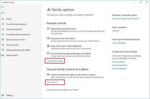 Windows Security also has a "Family options" area, but it's not a place where you can manage any settings. Instead, it offers access to your Microsoft account to manage parental control and other devices connected to the account.