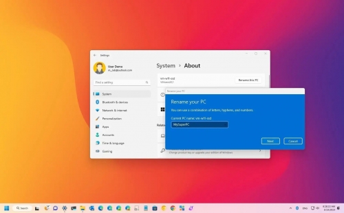To change the computer name in Windows 11, click the “Rename this PC” button for the setting that shows the device’s current name at the top of the “About” settings. Then type a new PC name into the “Rename your PC” dialog box that opens and click the “Next” button to continue. Then click the button in the next screen for the restart option you prefer. You need to restart the computer to apply the name change.