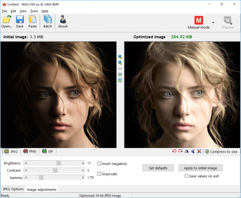 - works in dual view: (original – optimized image) or single view (optimized image).