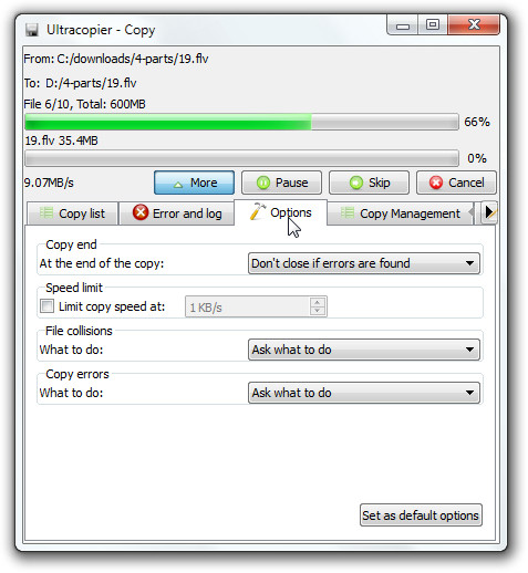 Ultracopier (formerly) SuperCopier is an advanced replacement for the standard Windows copy command. It supports pause and resume of ongoing copy operations, adjustable copy speed settings, automatic renaming of old files and more.