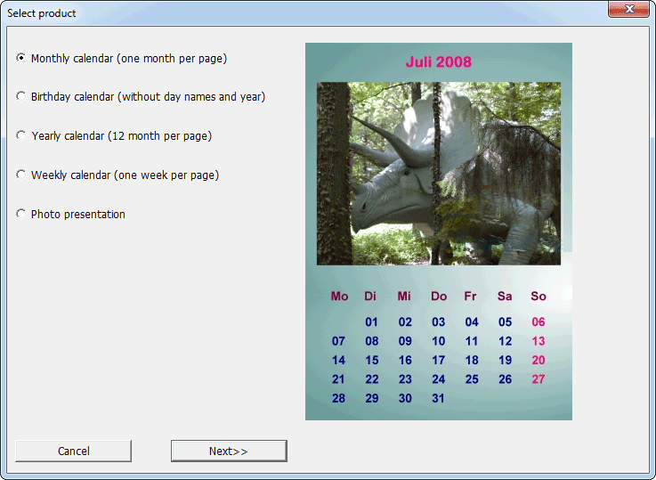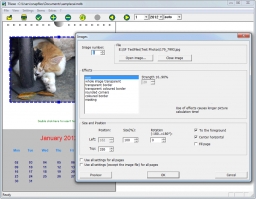 TKexe Designer (formerly TKexe Kalender) enables you to create printable calendar pages from your personal photos or designs. You can add up to 20 images to each monthly display and customize the page layout via drag and drop of elements. The design can be applied individually to each page or the entire year. Other features include support for personal events, public holidays (10 countries), image effects, gradients and more.