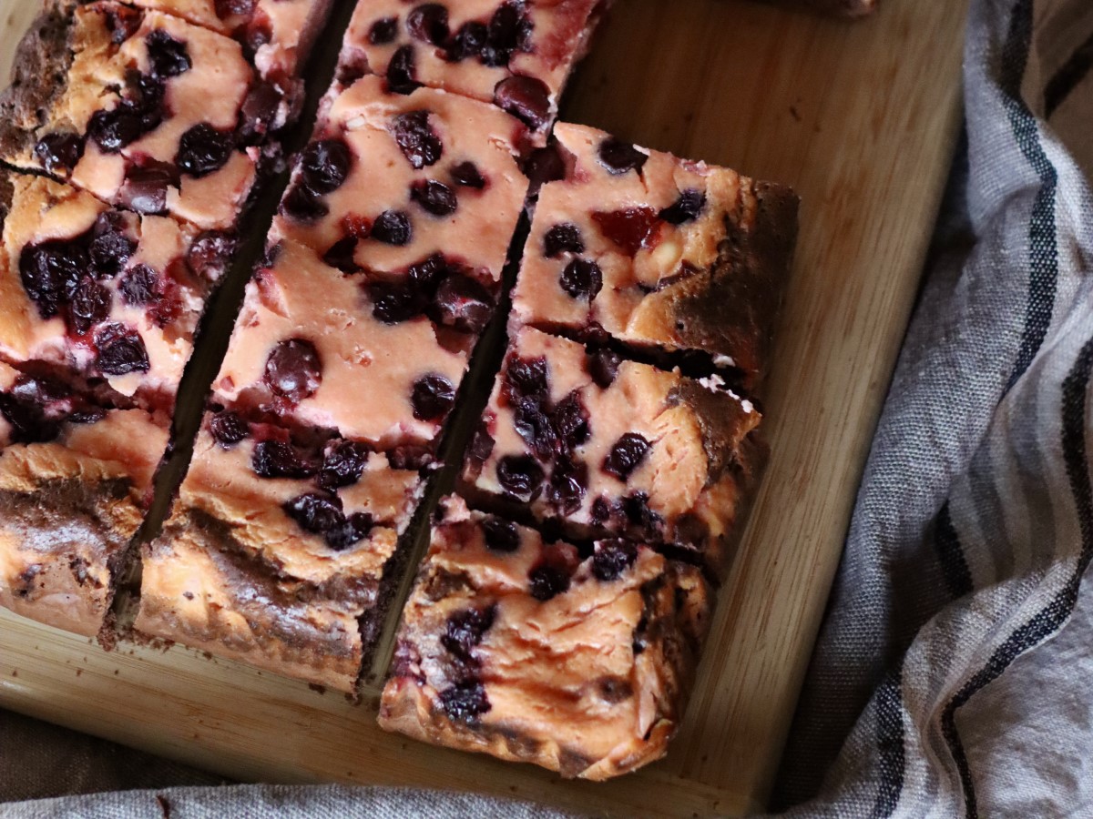 V pekač na dno razporedimo biskvitno testo, nato z žlico nadevamo nadev, v enakomerni plasti po celi površini, čisto na koncu lepo razporedimo odcejene višnje.