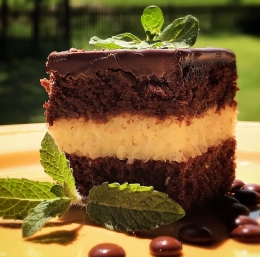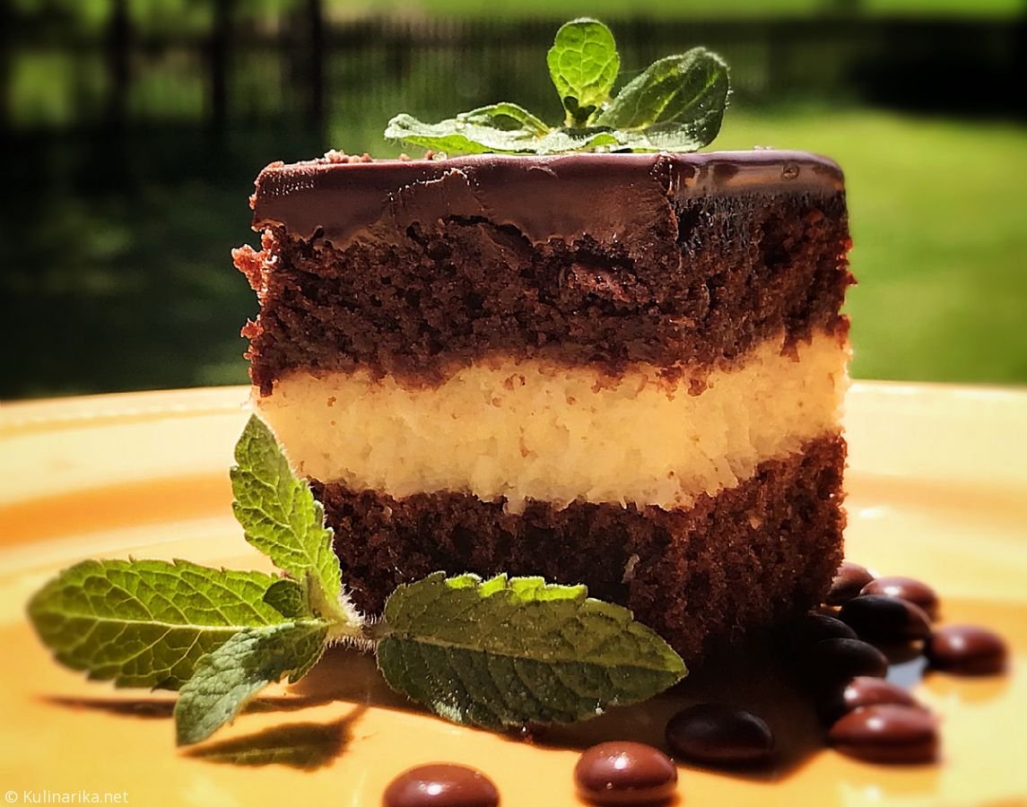 Kuhamo par minut, da se zgosti, nato dodamo kokos. To polijemo po pečenem testu, na to pa še drugo polovico (še nepečenega) testa. Pečemo še 20 minut(oziroma dokler ni pečeno, odvisno od pečice) ter polijemo s čokoladno glazuro.