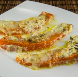 Pečena buča z jajci je okusna vegetarijanska glavna jed.
