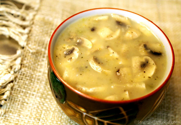 1–1 skodelica vode 1 r čebula, narezana 4 skodelice vode 4–6 gob, narezanih na kocke ali lističe 2 velika, rdeča krompirja, olupljena in narezana na kocke 1 majhen sladek krompir ali jam, olupljen in narezan na kocke 2 rezini zelene, sesekljane 2 čajni žlički suhih zelišč (npr. italijanske ali provansalske mešanice) 1 čajna žlička suhe bazilike 1 čajna žlička mlete paprike 1 čajna žlička mletega česna 1 čajne žličke mlete čebule 1 čajne žličke mletega muškatnega oreška 1 skodelica vode 10–12 gob, narezanih na kocke ali lističe 1 skodelica rastlinskega mleka (najbolje nesladkanega mandljevega)