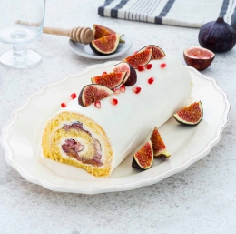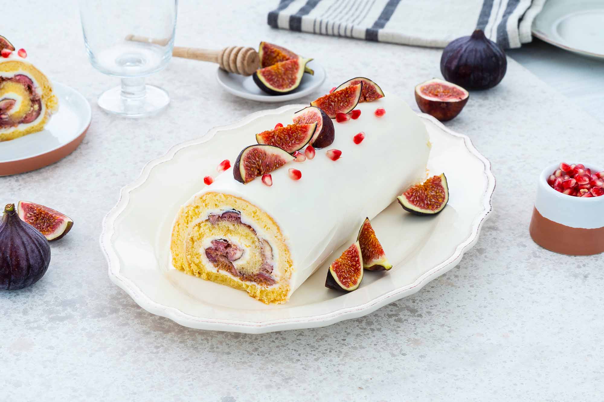 Ohlajeno rolado premažemo s preostankom kreme in jo okrasimo s svežimi figami in s semeni granatnega jabolka.