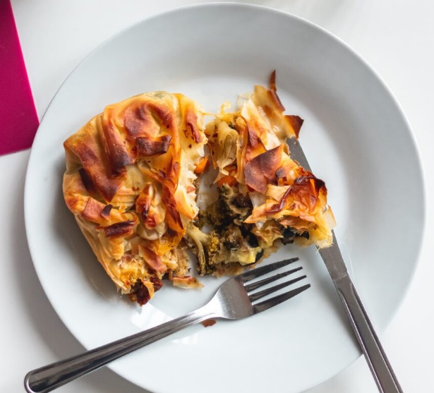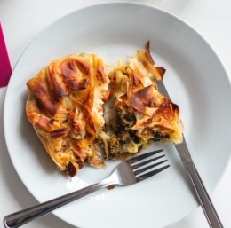 za 6 porcij 1 kg Špinača 2 x Čebula 2 stroka Česen Olivno olje Muškatni orešček 1 x Limona 100 g Sir feta 10 g Peteršilj 10 g Koper 200 g Jogurt 4 x Jajce 170 g Filo testo 10 g Sir