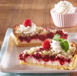 3. Zmešajte skuto s sladkorjem in vaniljevim sladkorjem, jajcem in pudingom v prahu. Pečeno testo vzemite iz pečice, odstranite fižol in peki papir. Po testu razporedite skutni nadev. Obložite z malinami in posujte z drobljencem, pripravljenim iz moke, sladkorja in masla.