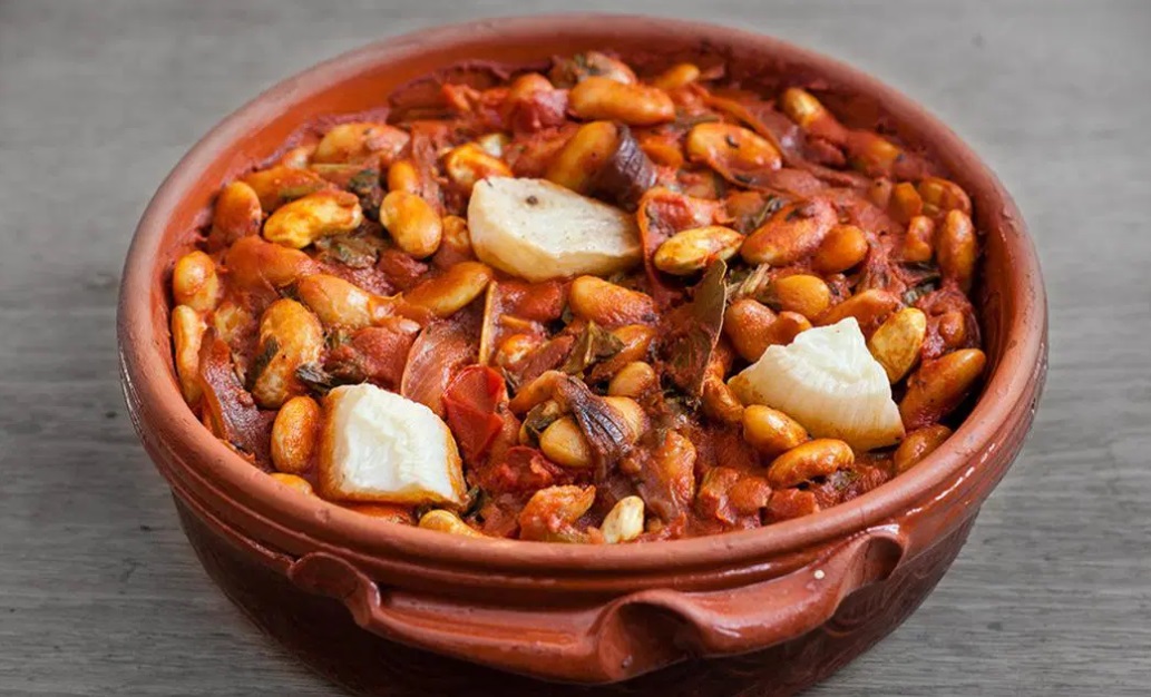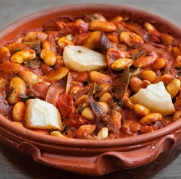 3 Pekač namažemo z oljem. Po plasteh naložimo fižol in čebulo. Na vrhu naj bo fižol. Prelijemo ga z oljem, ki je ostalo od čebule in dodamo malo vode, v kateri se je kuhal fižol.