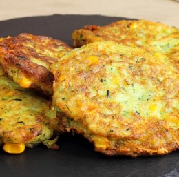2 srednje veliki bučki 1 čebula, drobno sesekljana 2 stroka česna, sesekljana 1 skodelica naribanega sira (npr. parmezan, cheddar ali gouda) 1/2 skodelice drobtin (koruzne ali drobtine iz kruha) 2 jajci 2 žlici sveže sesekljanega peteršilja Sol po okusu Poprova mešanica po okusu Oljčno olje (za peko)