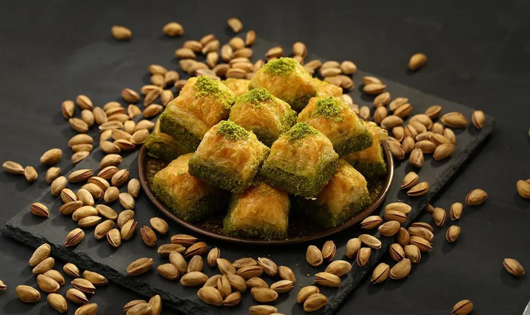 2 V globlji, z maslom in oljem namazani pekač položimo 7 do 8 plasti vlečenega testa. Prvo plast testa z obeh strani namažemo z mešanico masla in olja, vsako naslednjo plast tudi, na zadnjo pa damo pistacije. Nadaljujemo z nizom 3 do 4 plasti testa, ki jih znova premažemo z oljem in maslom, na to pa ponovno dodamo pistacije.