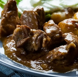 3 V kozico k mesu dodamo šampinjone in narezan feferon. Premešamo, dodamo še česen, kumino, origano, timijan, lovor, mleto rdečo papriko ter premešamo, solimo in popramo. Prilijemo belo vino ter pokrijemo. Dušimo približno eno uro.
