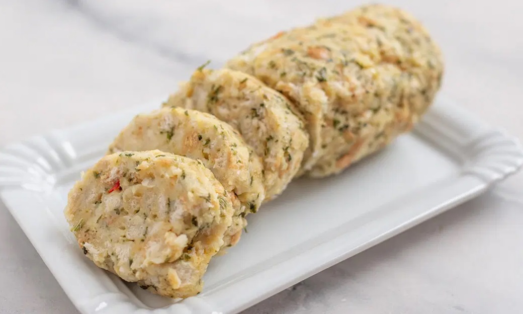4 Kuhinjski prtiček zmočimo, dobro ožamemo in ga razgrnemo na pult. Potresemo ga z drobtinicami in nanj položimo kruhovo maso, ki jo s pomokanimi rokami oblikujemo v rolado. Prtiček zavijemo, povežemo s kuhinjsko vrvico in kuhamo pol ure v osoljenem kropu.