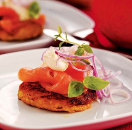 Bučne polpete serviramo z rezinami prekajenega lososa ter okrasimo s kislo smetano, čebulo in drobnjakom.