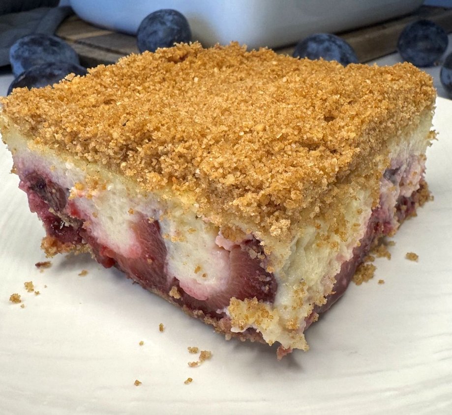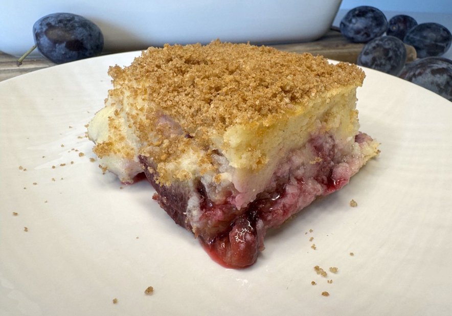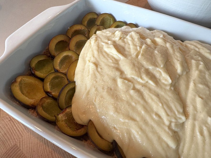 V pekač zlijemo zdrobovo kremo in z njo v celoti prekrijemo slive ter jo po vrhu pogladimo. Posujemo s preostankom drobtin.