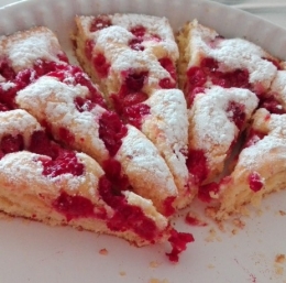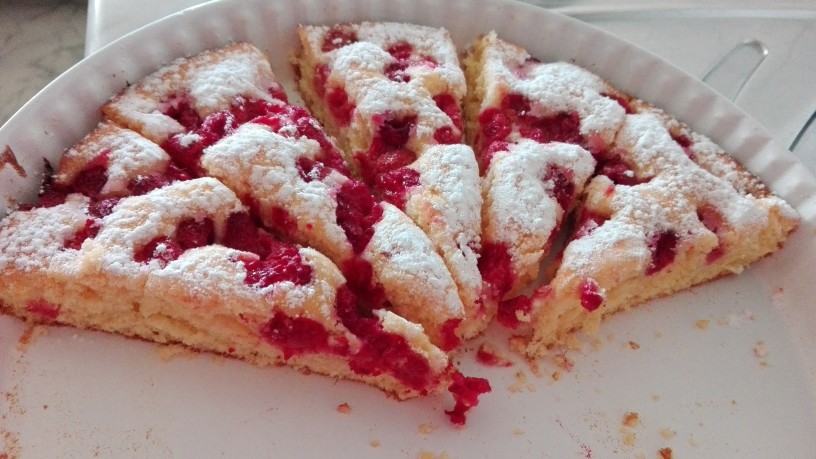 Testo pretresemo v pripravljen pekač in ga z lopatko razporedimo po dnu. Po testu potrosimo maline.