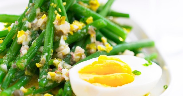 60 dag stročjega fižola, 4 večji krompirji, 4 jajca, 8 inčunovih filejev, 3 stroki česna, pol šopka peteržilja, olivno olje, kis, sol, poper. PRIPRAVA: