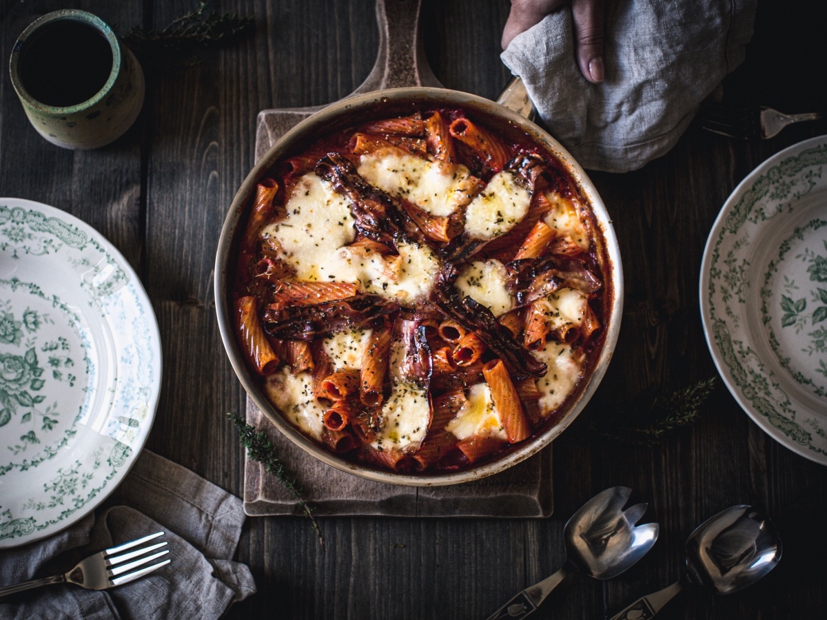 2–3 stroki česna 500 g pasiranega paradižnika 0,5 l vode 200 g testenin – rigatoni ali po vaši izbiri, mi smo uporabili tortiglione sol, poper 2 ščepa rjavega sladkorja mocarela, dimljena slanina ali panceta zelišča, oljčno olje