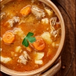 Na maščobi svetlo rumeno spražimo čebulo, dodamo meso in mešamo. Ko se mesni sok posuši, potresemo z moko, zalijemo s kostno juho, solimo, dodamo limonino lupinico, druge začimbe in skuhamo do mehkega.
