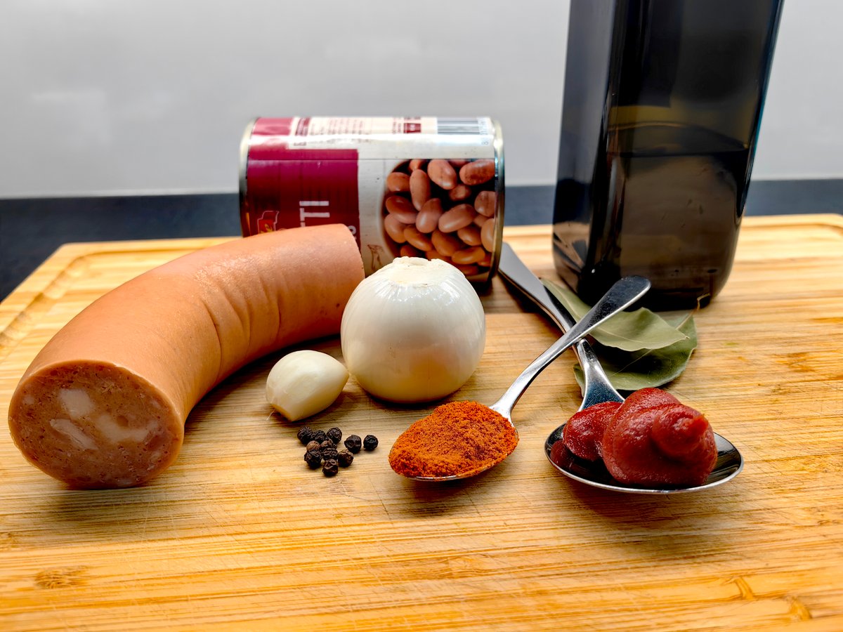 PostopekČebulo in česen olupimo ter ju drobno nasekljamo. Klobaso olupimo in narežemo na kolobarje.
