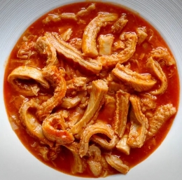 2 Olupljene paradižnike pretlačimo ter jih skupaj z žlico paradižnikove mezge in vampi primešamo zelenjavi. Jed po okusu solimo in popramo ter sladkamo z žličko sladkorja. Kuhamo 5 minut.