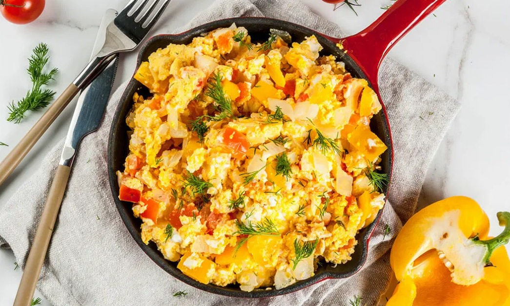 10 paprik 5 paradižnikov, zrelih 3 žlice oljčnega olja 2 čebuli 4 jajca sol poper