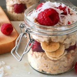 3 žlica ovsenih kosmičev 1,5 dcl rastlinskega mleka pol banane pest malin *arašidovo maslo (po želji) kokosovi ostružki za posip
