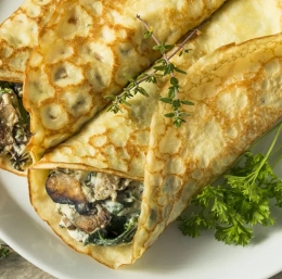 6 Pekač obložimo s peki papirjem, pečico segrejemo na 170°C. Palačinke namažemo z bešamelom, dodamo žlico gob in jih zavijemo. Polagamo jih na pekač. Ko namažemo vse palačinke, pekač za 10 minut postavimo v segreto pečico. Postrežemo še vroče, okrasimo jih s svežim peteršiljem.