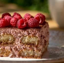 Tiramisu zaključimo s plastjo kreme in ga postavimo v hladilnik za najmanj 4 ure. Preden postrežemo, ga okrasimo svežimi malinami.