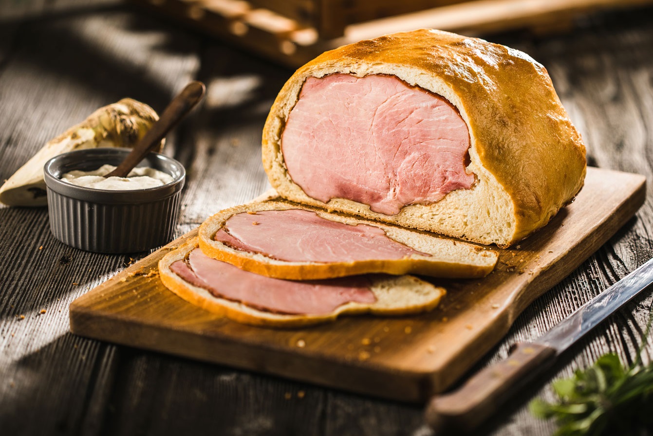 Vzhajanega razvaljamo na en centimeter debelo in na testo položimo kuhano šunko. Potresemo jo z rožmarinom. Šunko dobro obrišemo, ovijemo v testo, robove namažemo z mrzlo vodo in dobro zlepimo.