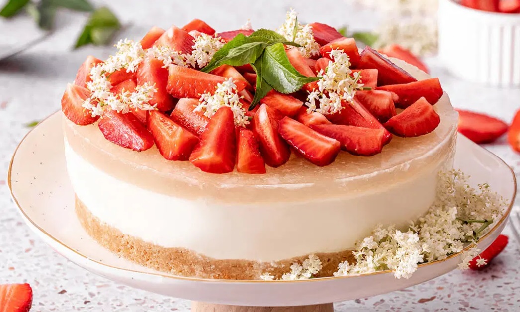 Jagode operemo in narežemo četrtine. Torto vzamemo iz hladilnika in po želatini razporedimo narezane jagode. Okrasimo še z bezgovimi cvetovi in, dokler torte ne postrežemo, postavimo v hladilnik.