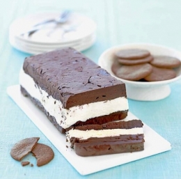 Pred postrežbo model previdno prevrnemo na servirni pladenj, pritisnemo robove folije in model odstranimo. S sladice odstranimo folijo in papir za peko, jo narežemo na rezine in postrežemo s poljubnimi piškoti.