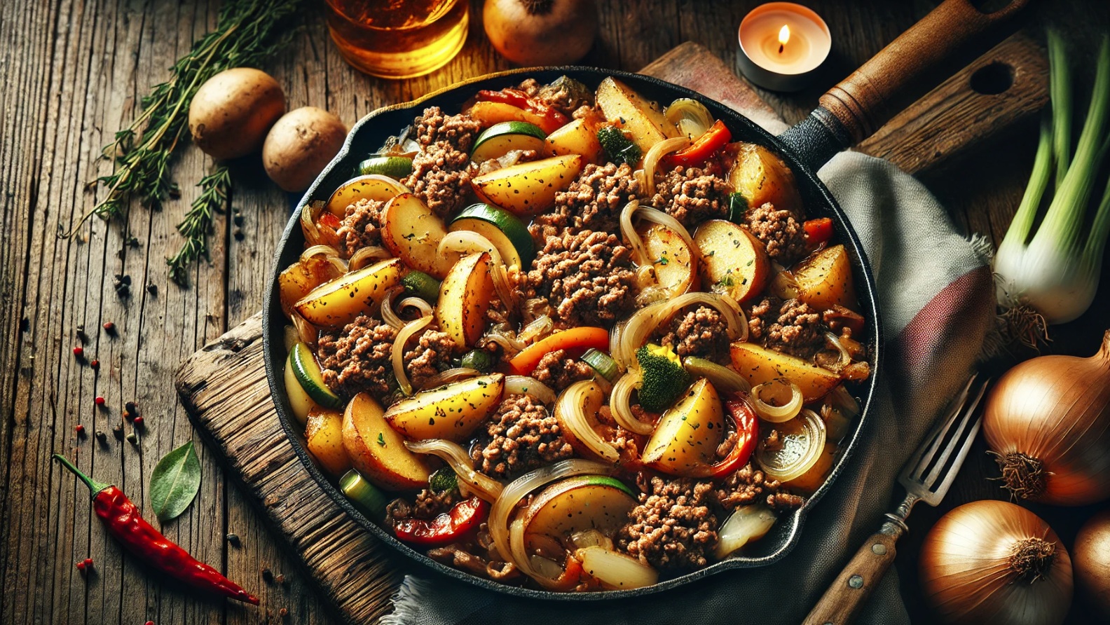 Če iščete hitro in preprosto jed, ki bo nasitila vso družino, je ponev z mleto govedino in krompirjem odlična izbira. Ta jed združuje okusno mleto govedino, mehak krompir in sveže zelenjavne sestavine v eni sami ponvi. Preprosta priprava in bogat okus bosta navdušila vse ljubitelje domače kuhinje.