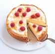 250 g maskarponeja 600 g kremnega sira 2 jajci 2 rumenjaka lupinica 3 limon 4 žlice moke 175 g sladkorja premaz in okras 1,5 dl kisle smetane 3 žlice limonove kreme ali marmelade pest malin (po želji)