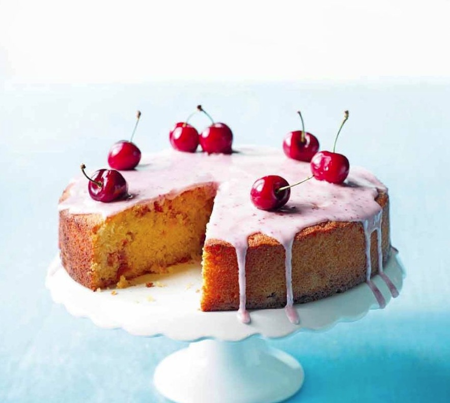 300 g grobo narezanih češenj brez koščic 250 g koruznega zdroba (polente) 250 g zmehčanega masla 250 g drobnega rjavega sladkorja 4 velika jajca 100 g zmletih mandljev 2,5 žlički pecilnega praška 1,5 dl navadnega jogurta sok ½ pomaranče češnje s peclji za okras