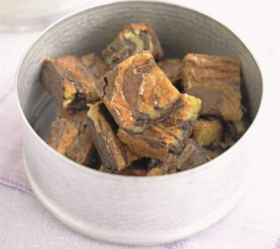 Kvadratni model velikosti 23 cm namastimo z maslom. Pečico segrejemo na 180 °C. Maslo narežemo na kocke. Obe čokoladi nasekljamo. Belo čokolado damo v večjo skledo in ji dodamo polovico masla, v drugo skledo damo temno čokolado in preostalo maslo. Vsako čokolado posebej raztopimo nad soparo, vmes pa neprestano mešamo, da dobimo homogeno mešanico.