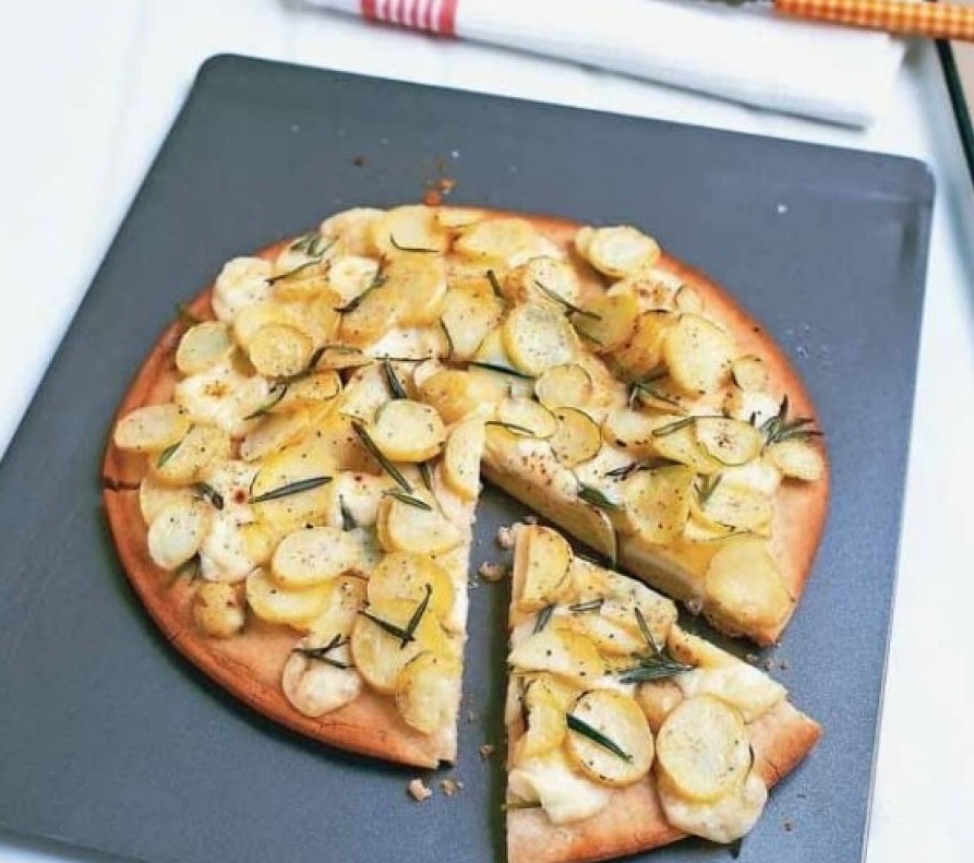 2 testeni osnovi po 150 g 230 g mladega krompirja 2 žlici oljčnega olja 2 vejici rožmarina sol poper 100 g sira brie