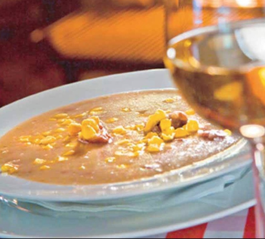 400 g zrn mlade koruze (bobičev) 250 g rjavega fižola v zrnu pršutova kost ali kos prekajenega mesa 150 g slanine (pancete) 5 strokov česna 500 g krompirja 150 g korenja sol poper peteršilj za posip
