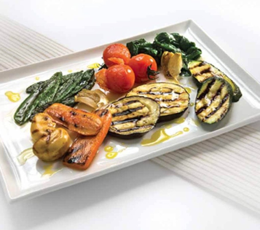 Segrejemo ploščo za žar, jo rahlo namastimo z oljčnim oljem in vso zelenjavo, razen špinače, spečemo. Na krožnik zložimo pečeno zelenjavo in blanširano špinačo. Zelenjavo pokapljamo z oljčnim oljem in postrežemo.
