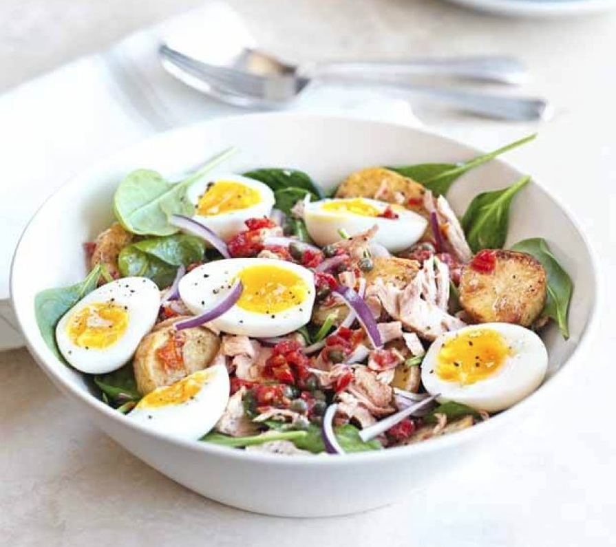450 g mladega krompirja 3 žlice oljčnega olja 4 jajca 1 žlica rdečega vinskega kisa 2 žlici kaper 50 g na soncu posušenih paradižnikov ½ rdeče čebule 100 g listov mlade špinače 300 g tunine iz pločevinke sol poper