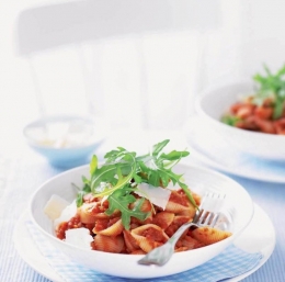 Testenine skuhamo po navodilih na zavitku, da so al dente. Medtem s paličnim mešalnikom omako pretlačimo, solimo in popramo ter damo nazaj na toplo. Kuhane testenine odcedimo in jih zmešamo z omako. Jed posujemo s parmezanom, po želji še z rukolo, in postrežemo.